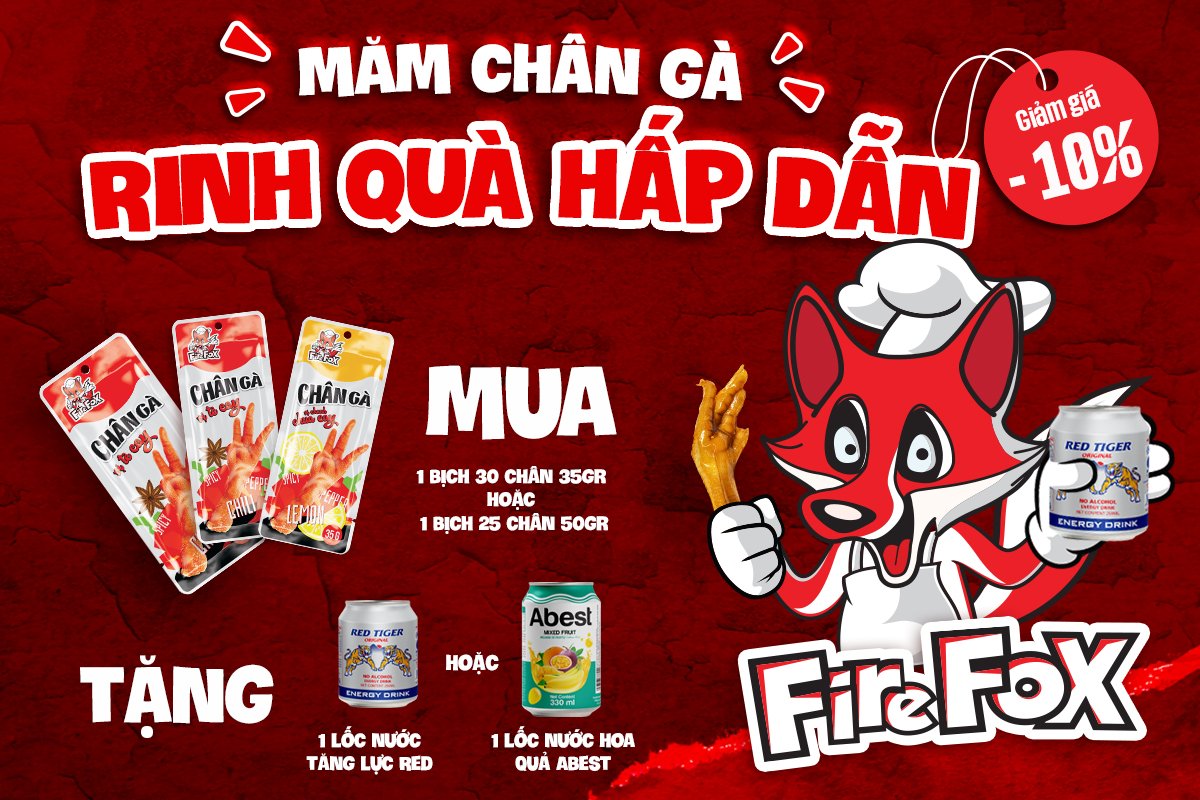 Nhanh tay chốt đơn nhận ưu đãi bạn nhé! *Các đơn hàng thực hiện qua website, facebook hoặc zalo 1 bịch chân gà gồm 30 chân gà Firefox tê cay hoặc chanh chua cay 35gr, hoặc 25 chân gà Firefox tê cay 50gr 1 lốc nước gồm 6 lon nước hoa quả ABEST (giao ngẫu nhiên vị) hoặc 6 lon nước tăng lực RED TIGER